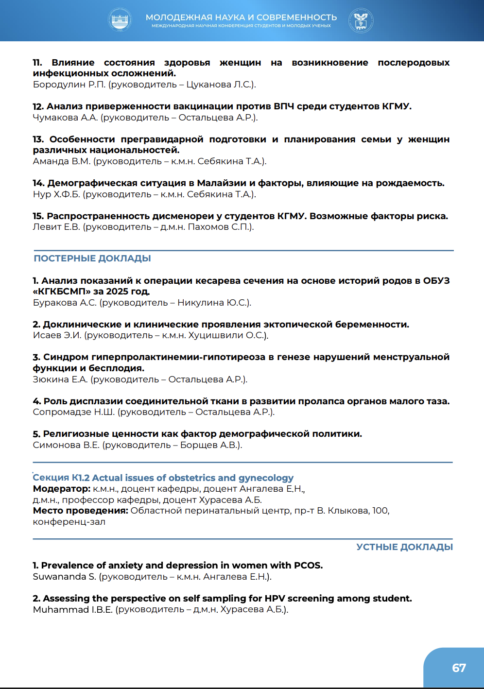 22 АПРЕЛЯ 2026 года в нашем университете возобновляется ежегодное международное мероприятие “МОЛОДЕЖНАЯ НАУКА И СОВРЕМЕННОСТЬ” 91-я Международная Научная Конференция Студентов И Молодых Ученых. На конференции запланировано 59 секций, а наши кафедры представлены в РАЗДЕЛЕ К1.2 "Актуальные Вопросы Акушерства и Гинекологии".