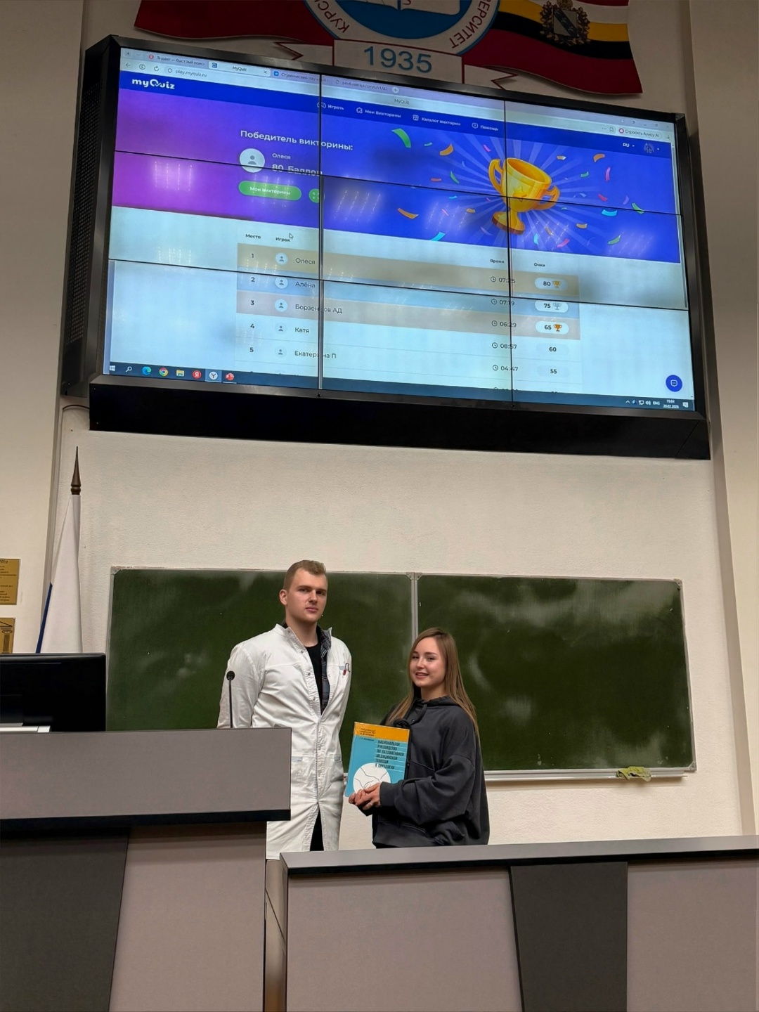В завершение заседания по сложившейся традиции прошёл квиз. Главный приз — книгу «Национальное руководство по паллиативной помощи в онкологии» — завоевала Алёна Лапицкая, студентка 6 курса и медицинская сестра отделения паллиативной помощи взрослым.