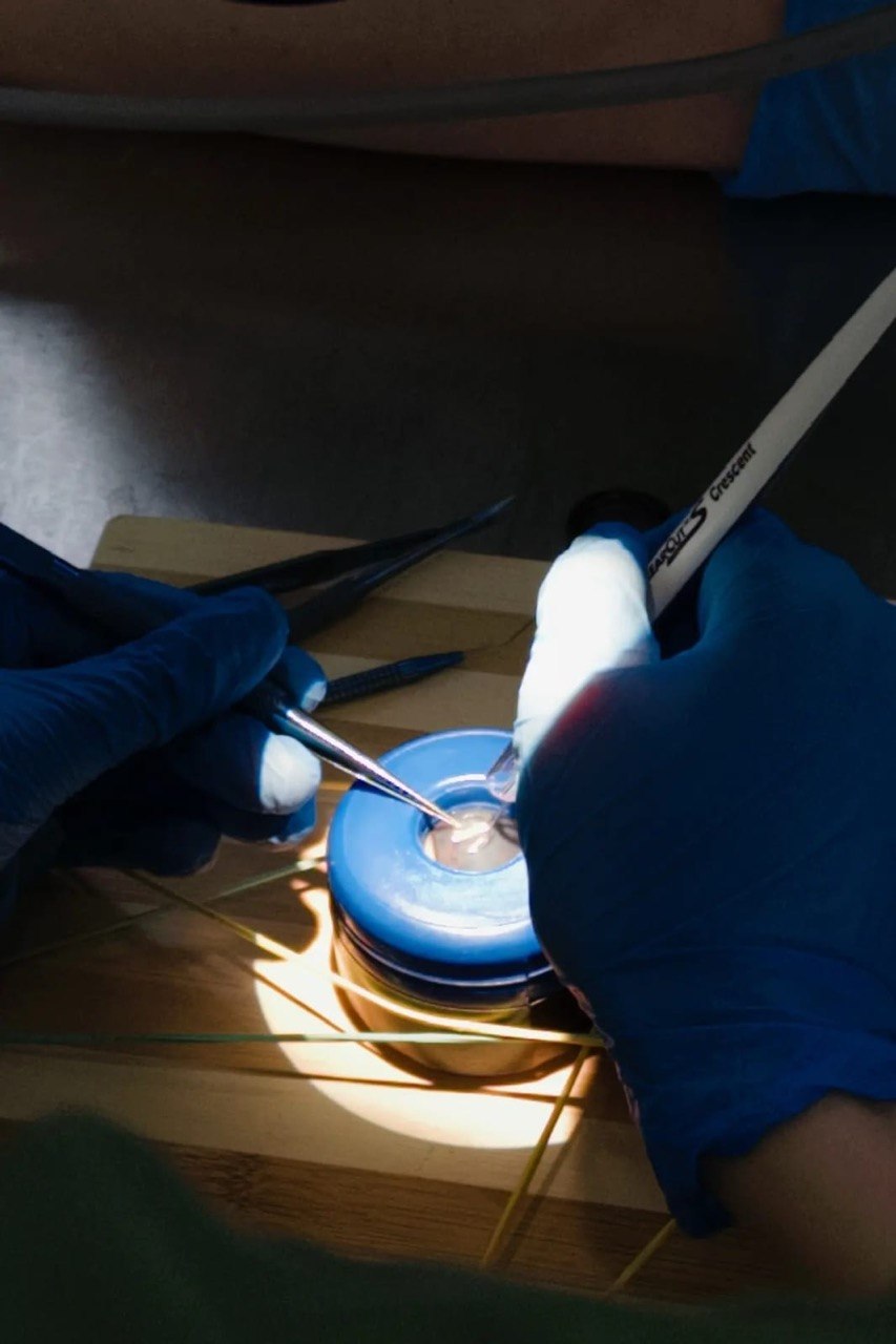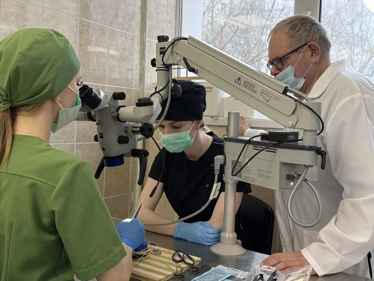 20 марта 2026 года члены СНК офтальмологии КГМУ в рамках операционного дня, организованного проектом "Школа хирургии: от наставника к преемнику " на базе лаборатории экспериментальной хирургии и онкологии НИИ ЭМ и ЭБК, провели переднюю послойную кератопластику — операцию по частичной замене роговицы. Ход их работы под микроскопом выглядел так: сначала будущие хирурги выполнили надрез роговицы трепаном, наметив границы замены. Затем наступил критический этап — расслоение тканей. После этого студенты удалили помутневший слой и подготовили «ложе» для трансплантата. Завершилась операция наложением микрошвов. Такая практика позволила студентам отточить точность движений на тканях толщиной всего 0,5 мм, превращая теорию в реальный хирургический навык. Проведение операции курировал д.м.н., доцент Березников А.И. Автор: староста СНК офтальмологии Лебедько Д.Д.