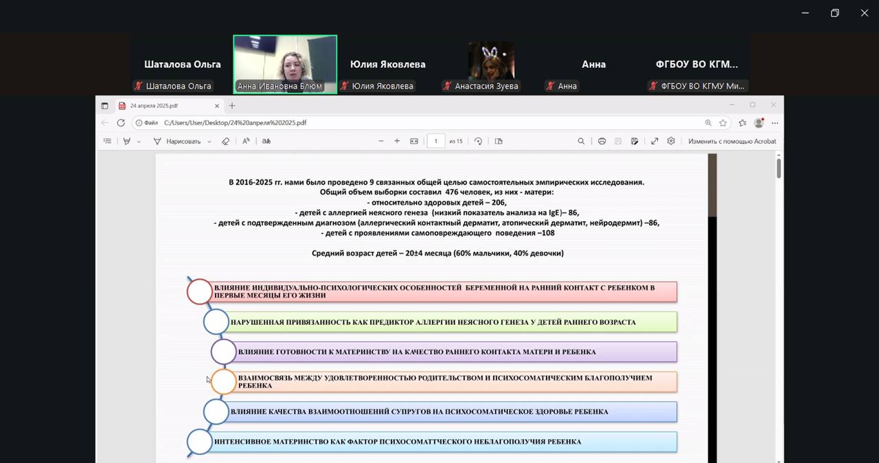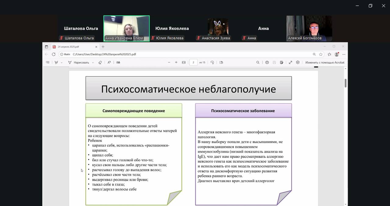 1. A.I. Blum, PhD in Psychology and Associate Professor in the Department of General and Clinical Psychology, presented current research in the field of children's psychosomatic health conducted at the department. In her presentation, she emphasized the importance of integrating psychological and medical knowledge in pediatric practice.