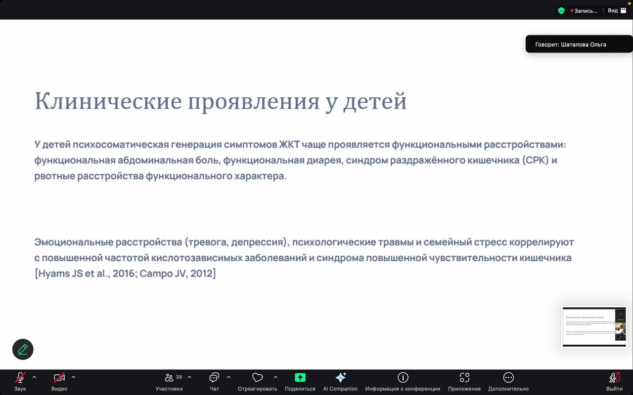 3. Шаталова О.Г. (6 курс, 4 группа, педиатрический факультет) осветила тему «Психосоматические аспекты заболеваний ЖКТ у детей», продемонстрировав связь эмоционального состояния с гастроэнтерологическими патологиями у детей и подростков.