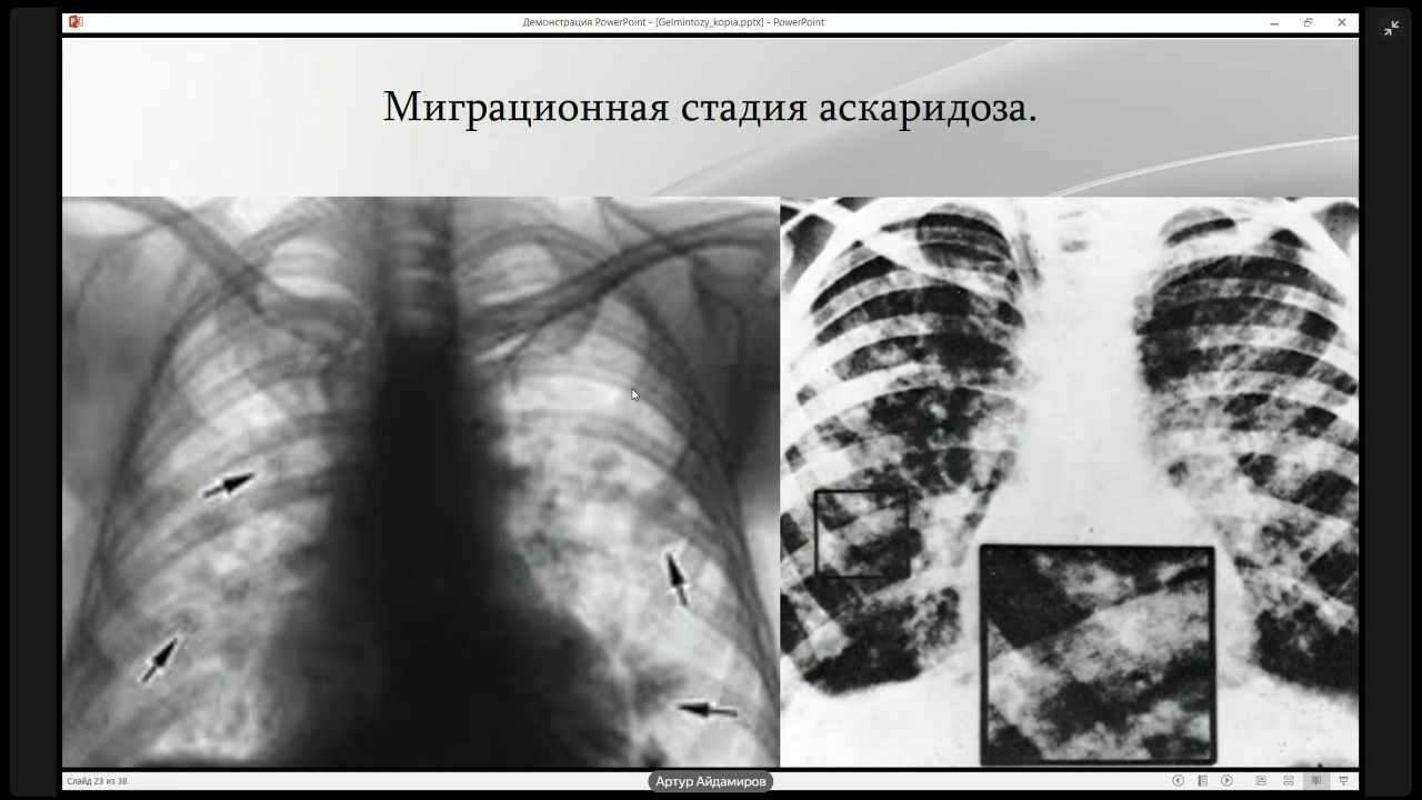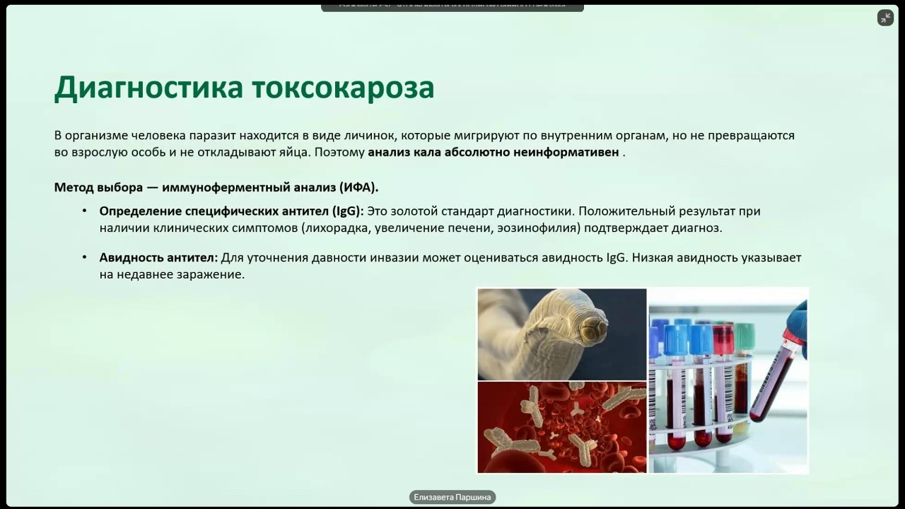 Первый доклад «Клиника, диагностика и лечение энтеробиоза, аскаридоза и токсокароза» представила студентка 2 группы 6 курса педиатрического факультета Паршина Е.А. В докладе были подробно охарактеризованы три наиболее значимых в педиатрической практике гельминтоза, различающихся по биологическим особенностям возбудителей, патогенезу и подходам к верификации диагноза. Особое внимание было уделено сложностям верификации этих паразитозов: от классического перианального зуда при энтеробиозе до полиморфной клиники токсокароза, нередко маскирующегося под бронхиальную астму. Докладчик подчеркнула важность дифференцированного подхода к терапии и обязательного контроля излеченности, особенно при семейных очагах инвазии.