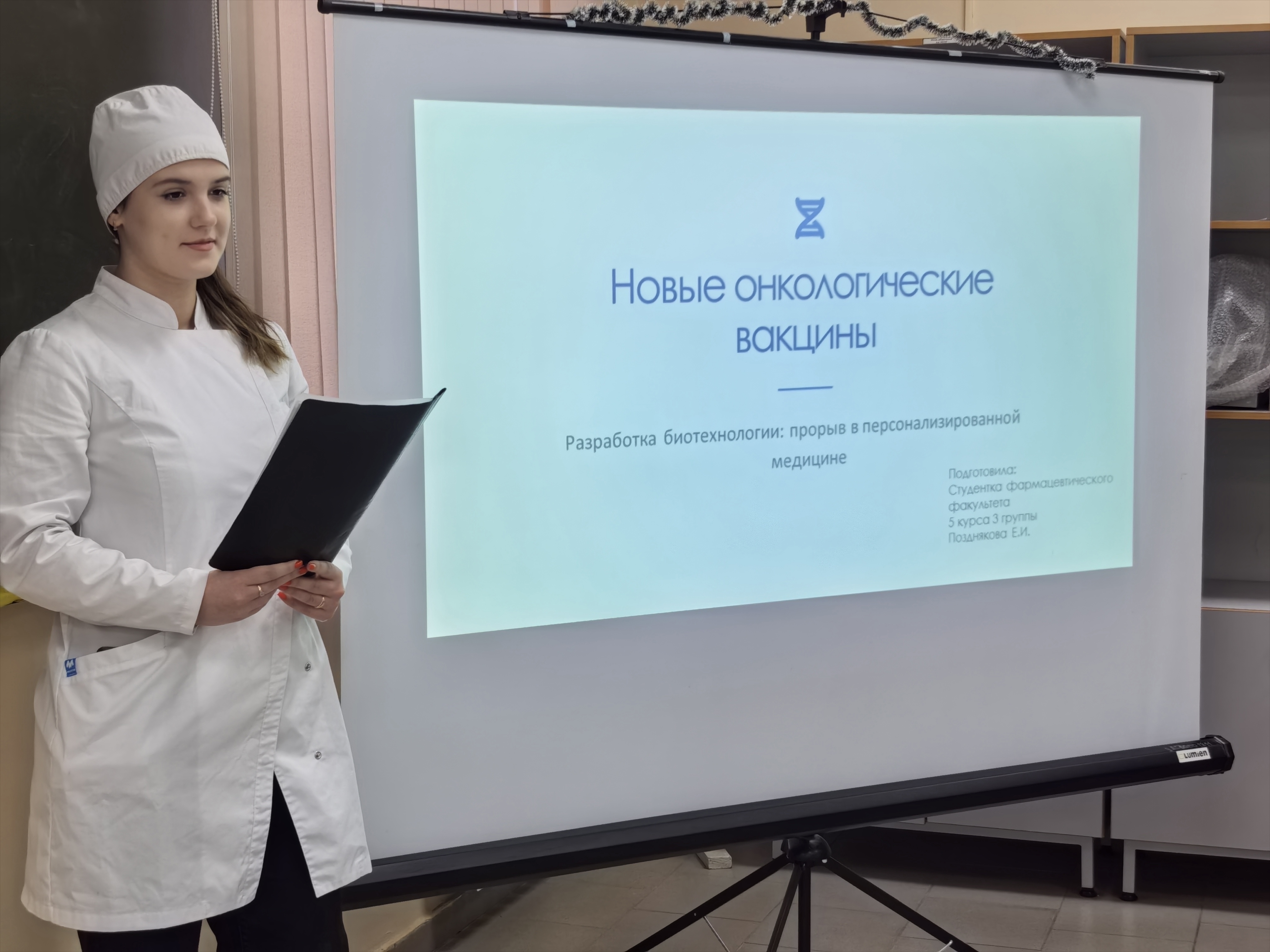 Позднякова Е.И. 3 гр. 5 курса доложила о достижениях в создании онкологических вакцин. Примером является персонализированная онковакцина, разработанная Федеральным медико-биологическим агентством (ФМБА), и представляющая собой дополнительную опцию в линейке традиционных методов лечения онкологических заболеваний кожи. Она нацелена на то, чтобы «обучить» иммунную систему распознавать и уничтожать опухолевые клетки, как это происходит при защите от вирусов.