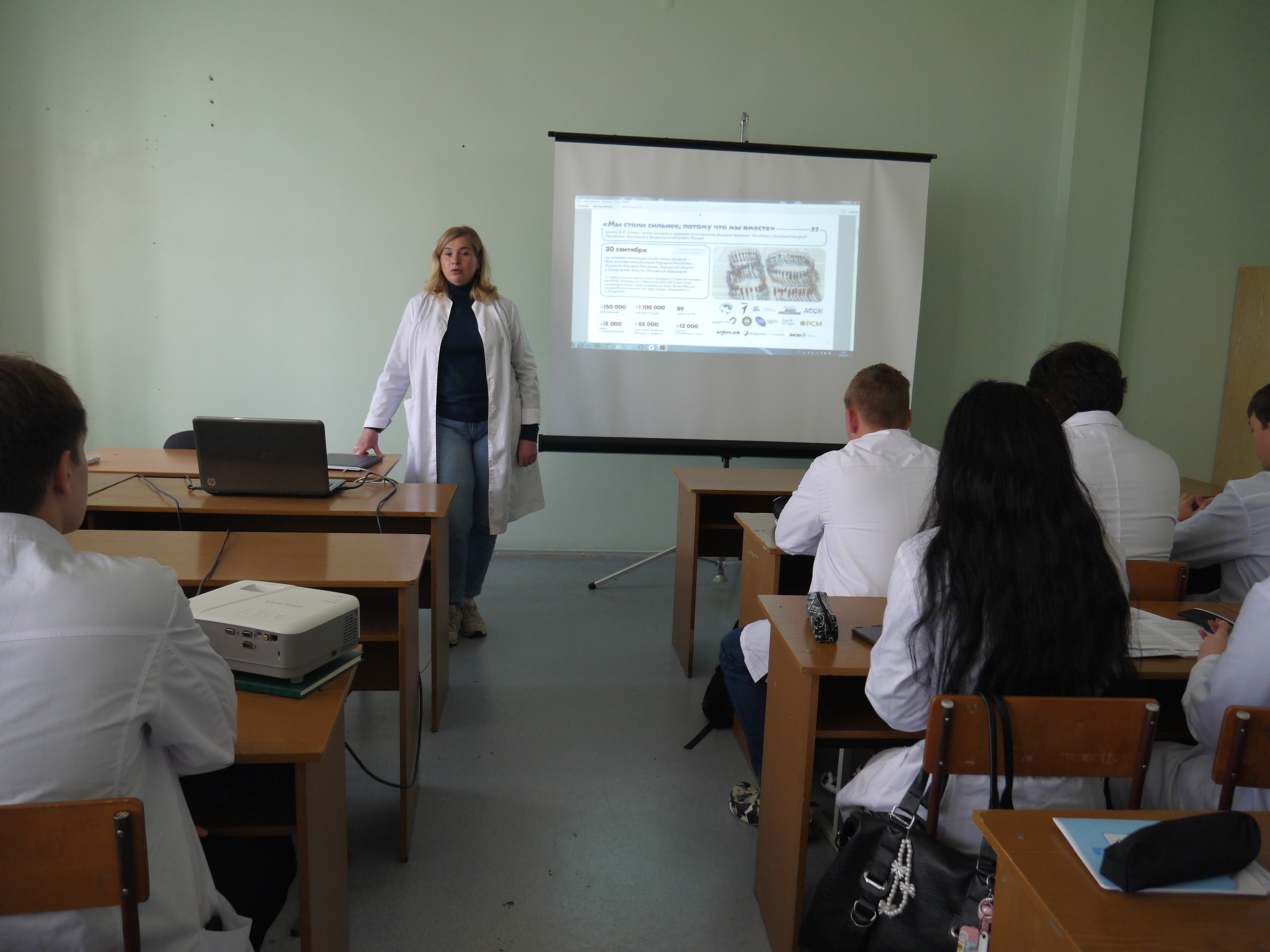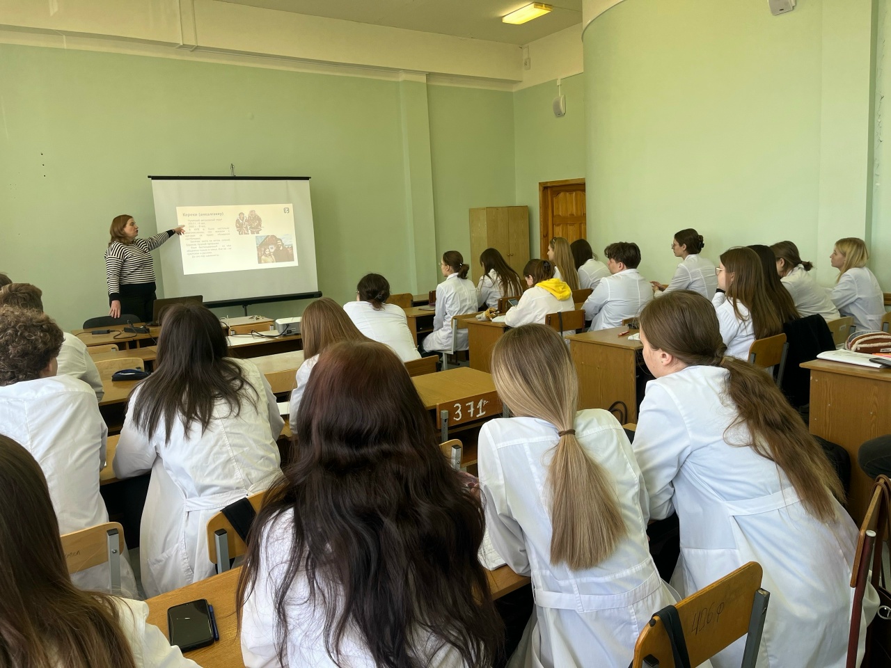 Открытая лекция заведующего кафедрой философии Е.С. Кравцовой перед студентами 1 курса лечебного факультета КГМУ