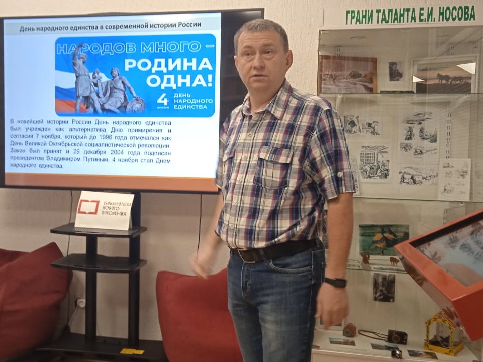 6 ноября 2025 г. в библиотеке-филиале№2 им. Е.И. Носова состоялся историко-литературный экскурс «Россия начиналась не с меча» для студентов Курской академии государственной и муниципальной службы, приуроченный к празднованию Дня народного единства.