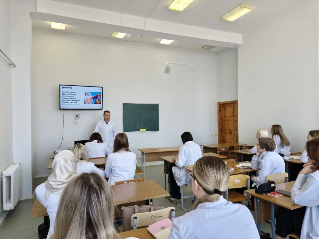 18 марта 12 лет назад был подписан договор о вхождении Крыма в состав Российской Федерации. Доценты кафедры философии С.А. Никифоров и Т.Г. Кульсеева прочитали лекции на тему «Крымская весна: Восстановление исторической справедливости (день воссоединения Крыма с Россией)». Они рассказали студентам лечебного, стоматологического факультетов и факультета клинической психологии о географии Крымского полуострова, об истории вхождения Крыма в состав России при Екатерине Великой, воссоединении Крыма с Россией в 2014 г., огромном значении Крыма для безопасности российского государства.