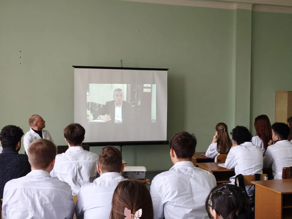 27 апреля 2026 г. студенты КГМУ посмотрели видеообращение губернатора Курской области А.Е Хинштейна, посвященное первой годовщине освобождения Курской области от украинских вооруженных формирований.