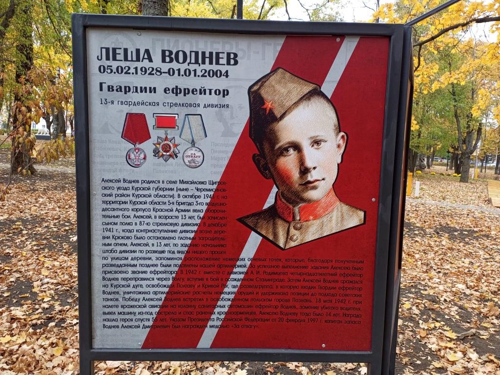 Стенд Лёша Воднев в аллее «Пионеры-герои» посвящен подвигам дедушки доцента кафедры физики, информатики и математики Курского государственного медицинского университета Гранкина Валерия Егоровича.