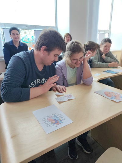 Волонтеры начали с рассмотрения карточек с прошлого занятия, чтобы вспомнить, где именно находятся эти важные органы и как они выглядят. Затем повторили их основные функции и роль в организме.