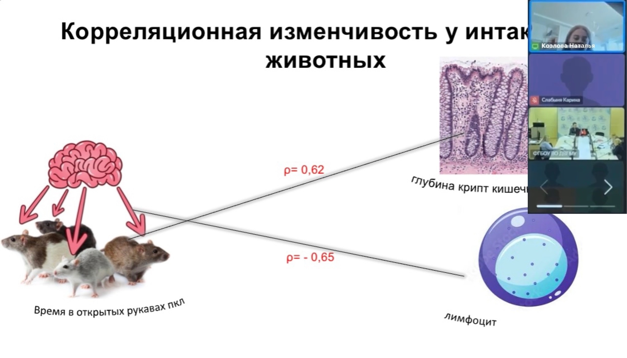 - Карина Слабыня, студентка 4 курса 13 группы лечебного факультета, выступила с докладом на тему: «Изучение влияния 28-дневного хронического стресса на показатели поведения и слизистой оболочки толстой кишки у крыс линии Вистар»