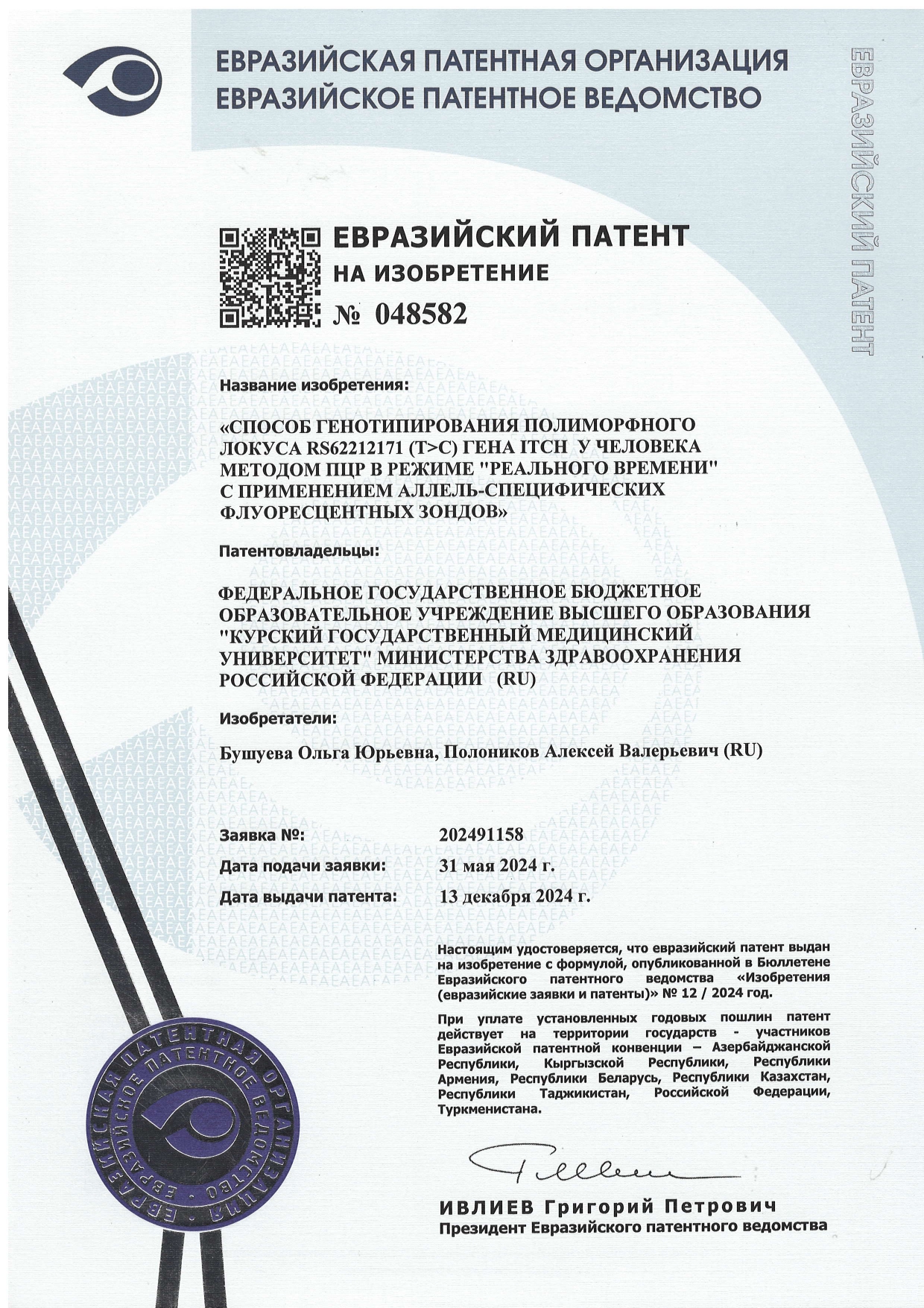 КОЛЛЕКТИВОМ НИИ ГМЭ РАЗРАБОТАН СПОСОБ ГЕНОТИПИРОВАНИЯ, ЗАПАТЕНТОВАННЫЙ ЕВРАЗИЙСКИМ ПАТЕНТНЫМ ВЕДОМСТВОМ