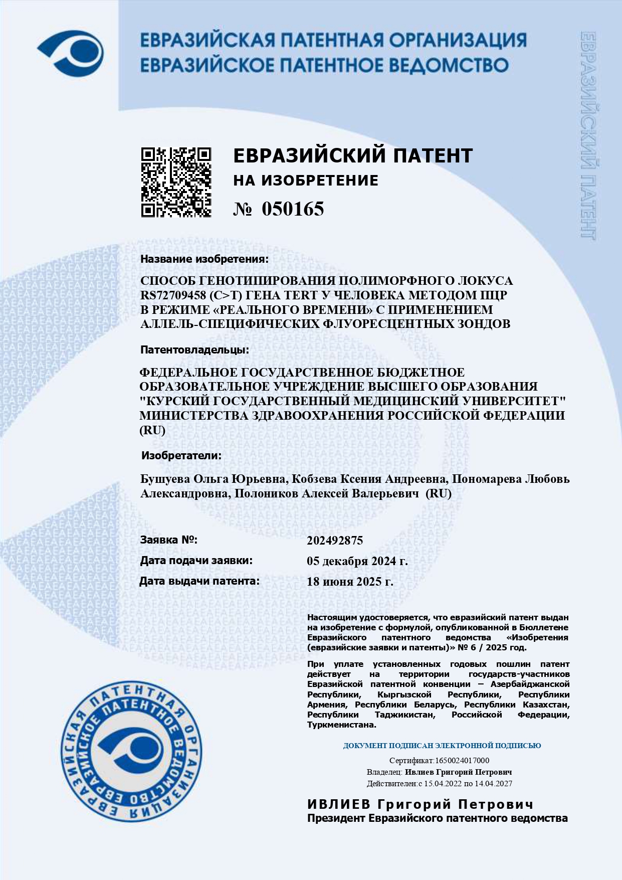 КОЛЛЕКТИВ НИИ ГМЭ ПОЛУЧИЛ ЕВРАЗИЙСКИЙ ПАТЕНТ НА ИЗОБРЕТЕНИЕ