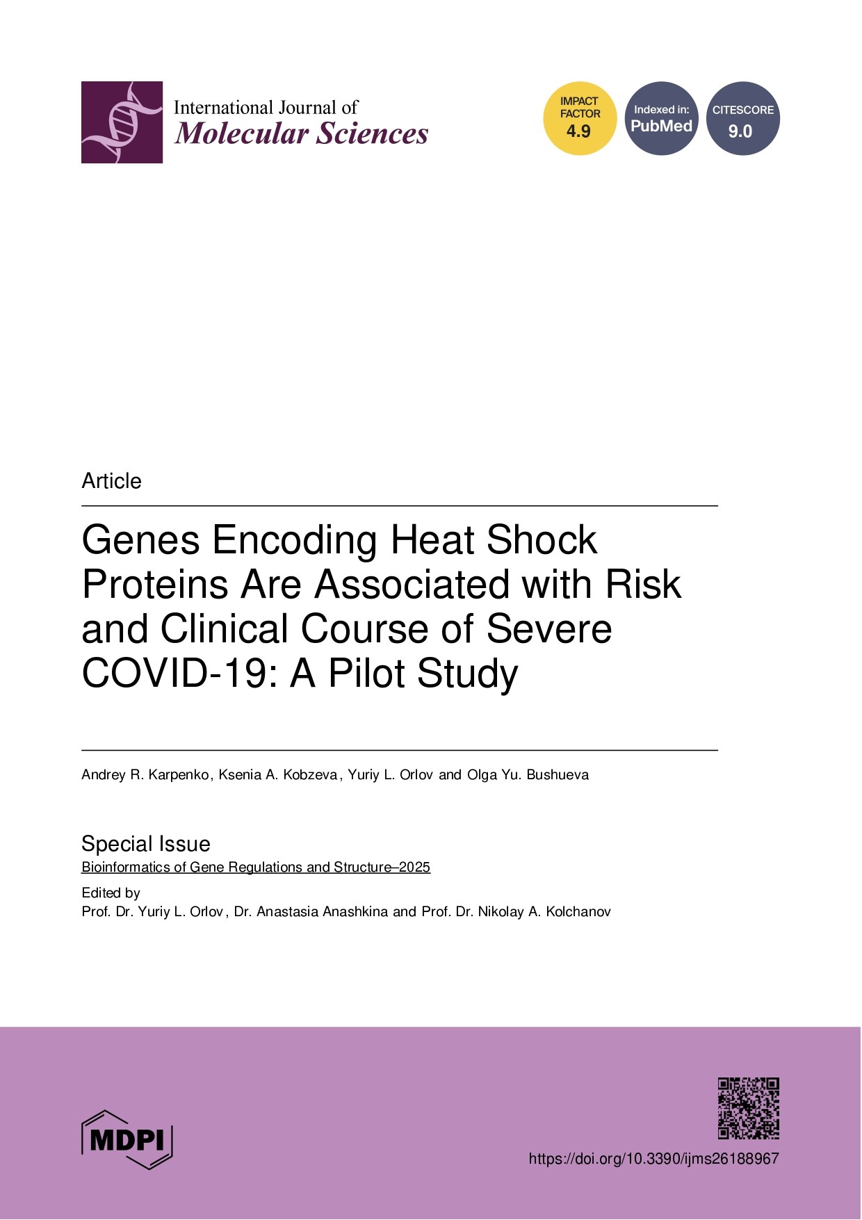 Ссылка на публикацию: Karpenko AR, Kobzeva KA, Orlov YL, Bushueva OY. Genes Encoding Heat Shock Proteins Are Associated with Risk and Clinical Course of Severe COVID-19: A Pilot Study. Int J Mol Sci. 2025 Sep 15;26(18):8967. doi: 10.3390/ijms26188967. PMID: 41009536; PMCID: PMC12469910.