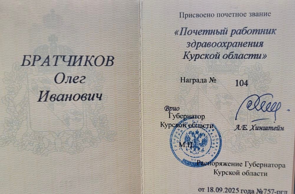 Олег Иванович был удостоен почётного звания «Почётный работник здравоохранения Курской области» с вручением нагрудного знака и соответствующего удостоверения.