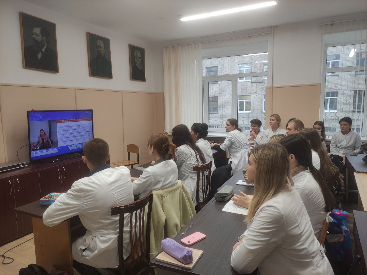 10.10.2025 г. в рамках проекта «Медицинский лекторий Минздрава России» профессорско-преподавательский состав кафедры психиатрии (заведующий кафедрой Плотников Д.В., доцент Бельских И.А., доцент Левченко Е.В., ассистент Котиков А.А., ассистент Зданович А.И.) вместе со студентами 5 курса лечебного факультета в режиме видеоконференцсвязи принимали участие в очередном мероприятии проекта: слушали лекцию Главного внештатного специалиста по специальностям "Психиатрия", "Психиатрия-наркология" Шпорт Светланы Вячеславовны на темы "Перспективы развития психиатрической службы в Российской Федерации", "Современное состояние и тренды развития наркологической службы в Российской Федерации".