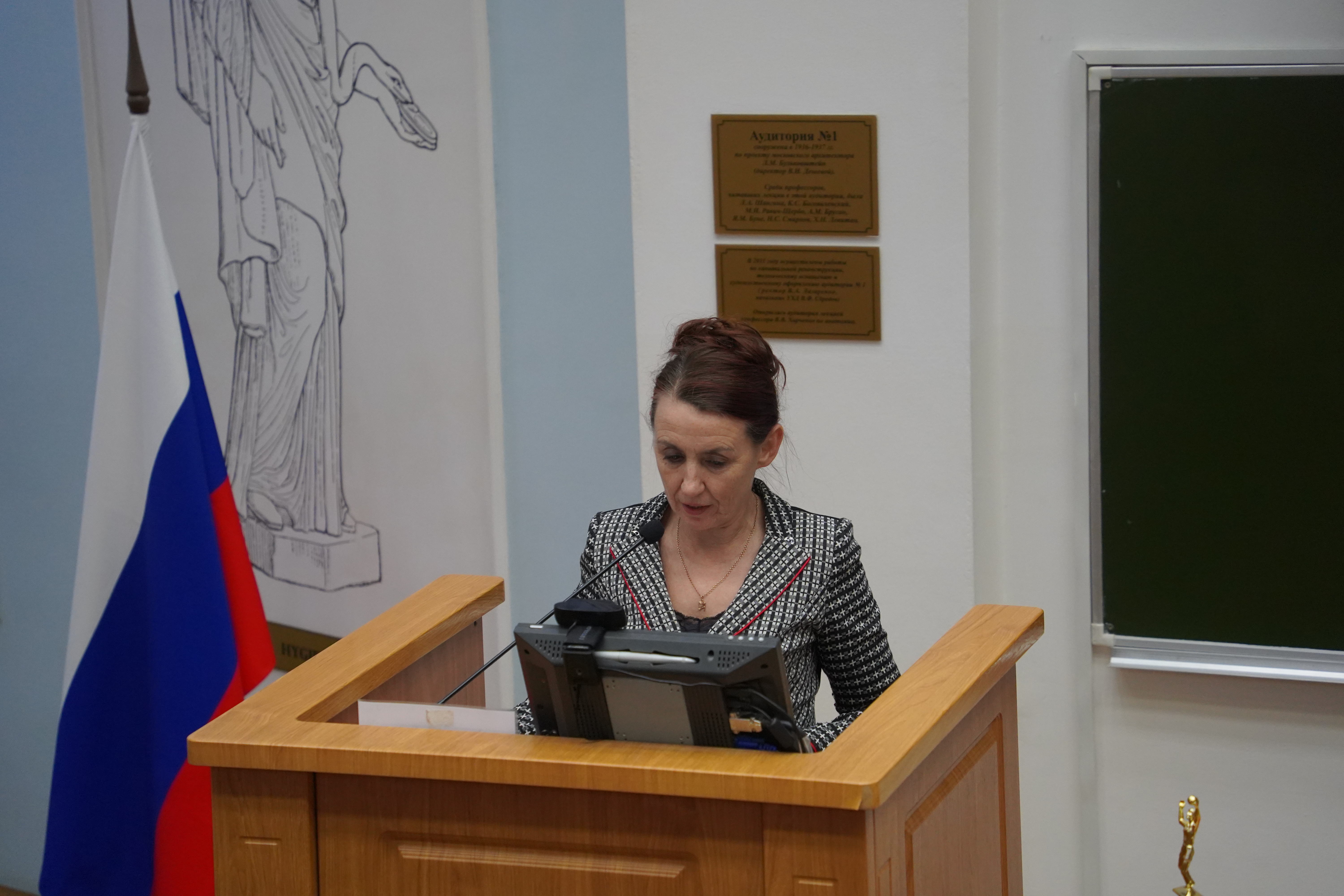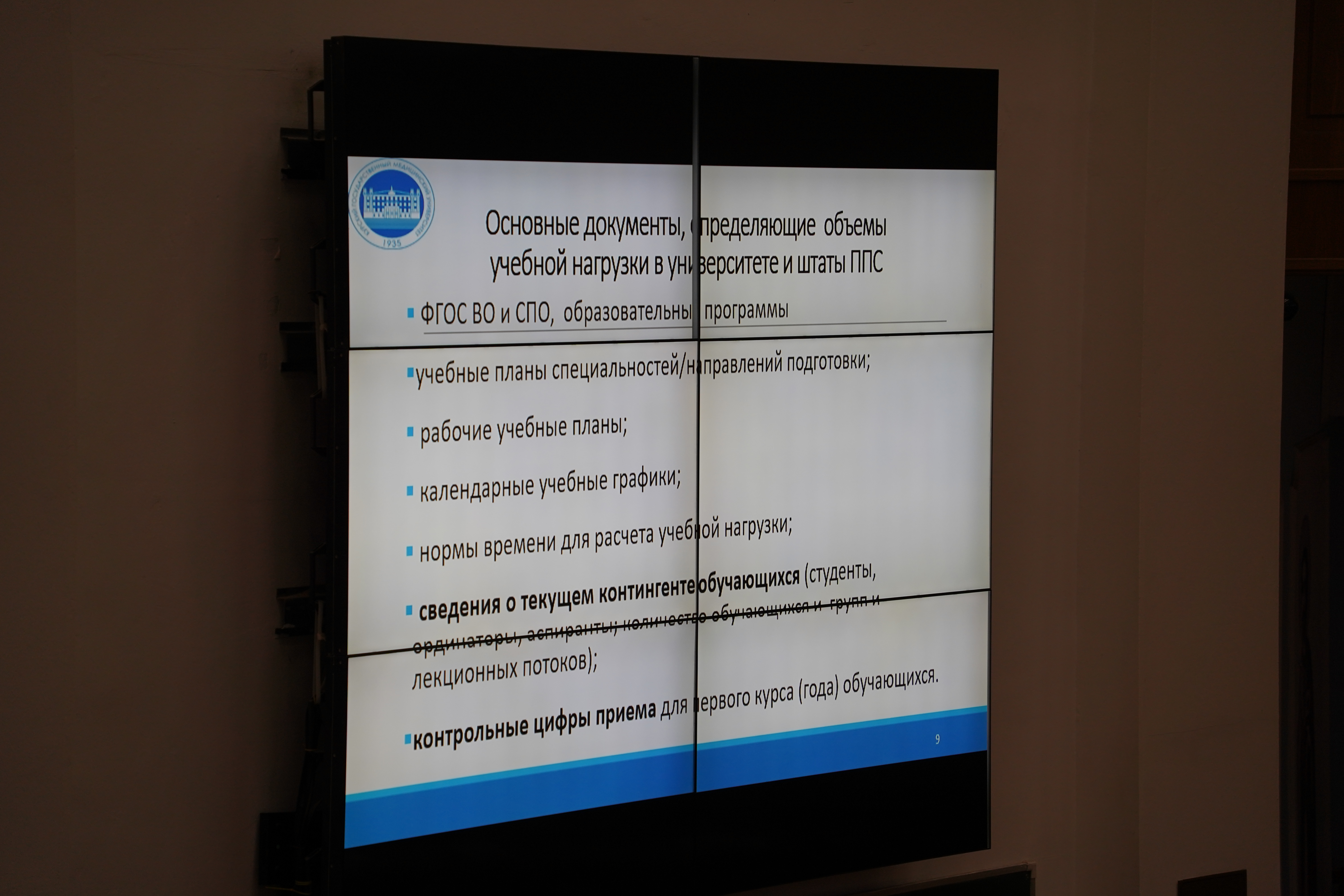 С первым вопросом повестки дня: «Результаты анализа выполнения научно-педагогическими работниками объёмов педагогической нагрузки за 2024/2025 учебный год» на трибуну поднялась начальник учебно-методического управления профессор Алла Ивановна Овод. Отметив, что по данной теме ситуация в вузе развивается позитивно, Алла Ивановна озвучила ряд мер, которые необходимо принять в ближайшем будущем: корректировки рабочих программ, расширение опыта включения в первые лекции материалов об истории университета, кафедр, о памятных датах в истории страны, о федеральных проектах и т.д.
