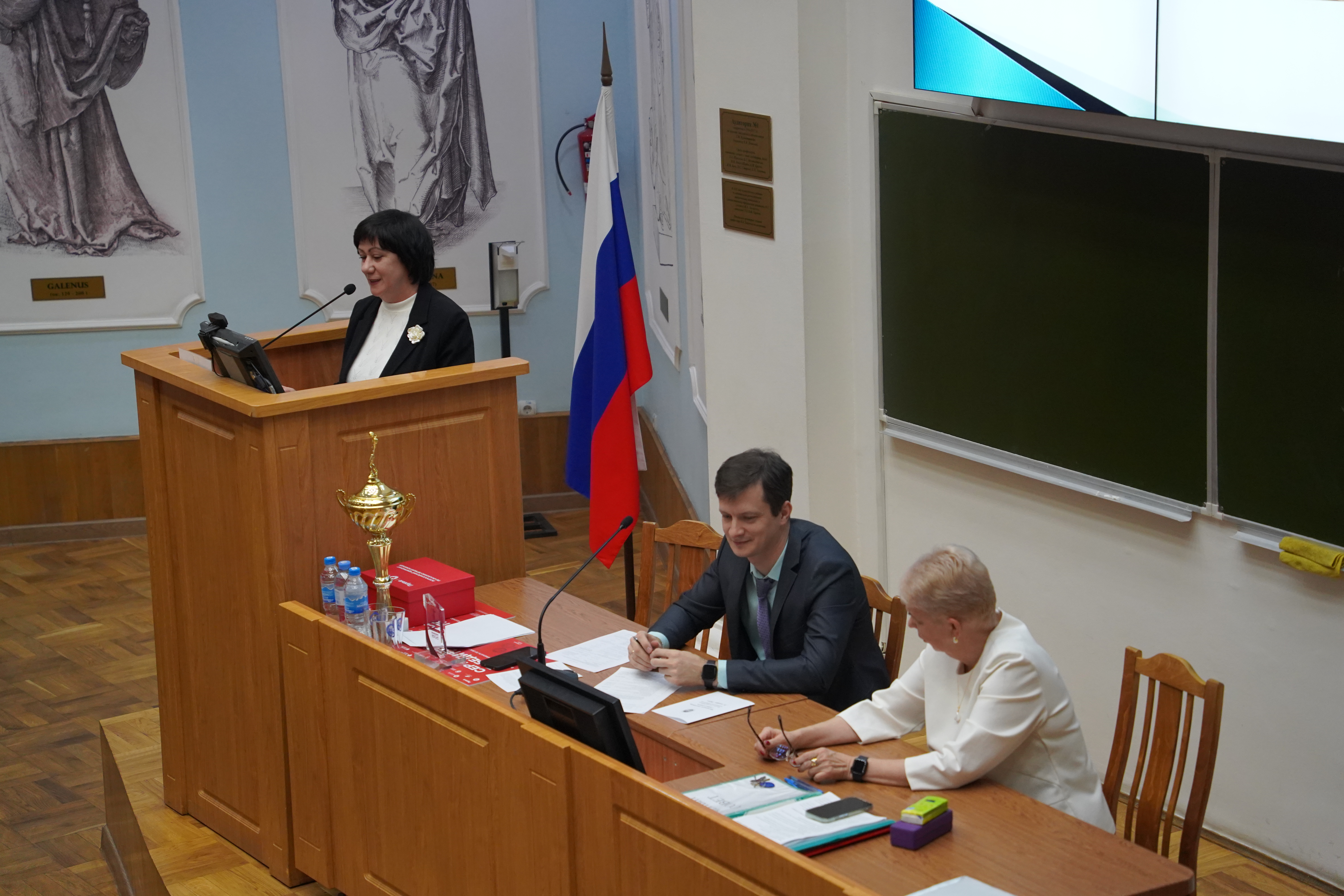 Вторым вопросом был отчёт кафедры инфекционных болезней и эпидемиологии об образовательной, воспитательной, научно-исследовательской и инновационной деятельности, лечебной работе и взаимодействии с органами практического здравоохранения за 5 лет, с которым выступила заведующий кафедрой инфекционных болезней и эпидемиологии доцент Виктория Валентиновна Киселева.