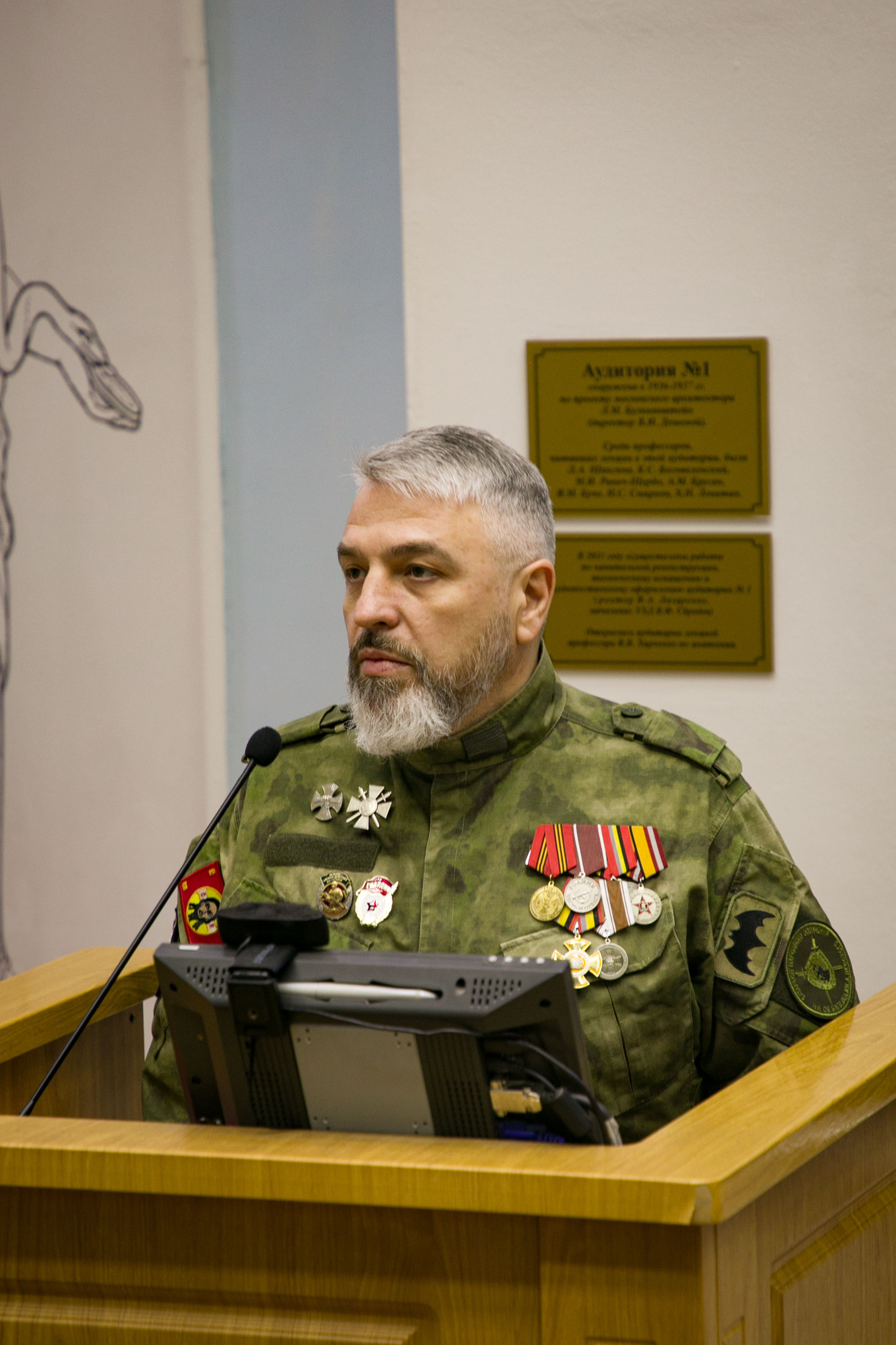 Фронтовой разведчик с позывным «Холод» на передовой принимал участие в СВО с 2022 по конец 2023 года. Юрий Юрьевич сражался за нашу Родину на участках фронта: Сватово-Кременная, Житловка, Авдеевка, Соледар, Тёткино. Он рассказал участникам мероприятия о своём ратном труде и о боевых буднях своих фронтовых товарищей.
