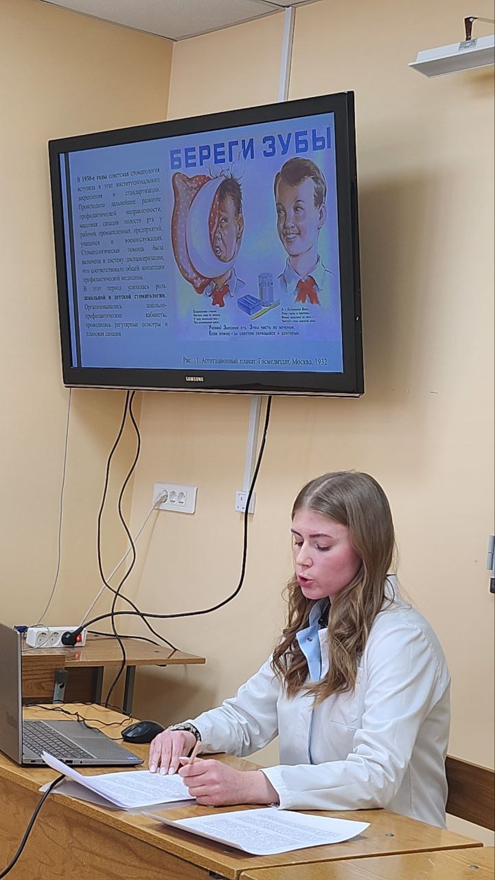 Участники подготовили насыщенную программу, охватившую ключевые вехи развития зубоврачевания — от древних времён до современных высокотехнологичных методов. Особое внимание докладчики уделили биографиям и научным достижениям выдающихся врачей, чей самоотверженный труд заложил фундамент современной стоматологии. В общей сложности было представлено восемь докладов. Каждое выступление сопровождалось мультимедийной презентацией, вызвало живой интерес аудитории и переросло в активную научную дискуссию.