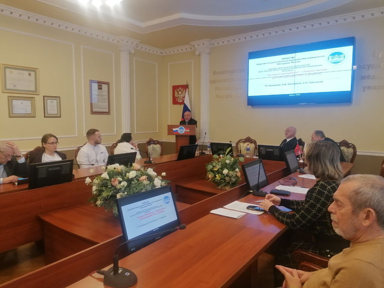 Открыл конференцию ректор, заслуженный врач Российской Федерации, заслуженный деятель науки Российской Федерации, почетный гражданин города Курска, д.м.н., профессор В.А. Лазаренко. Виктор Анатольевич отметил выдающиеся заслуги своего учителя профессора А.Д. Мясникова перед отечественным здравоохранением, вклад Альберта Дмитриевича в научную работу университета.