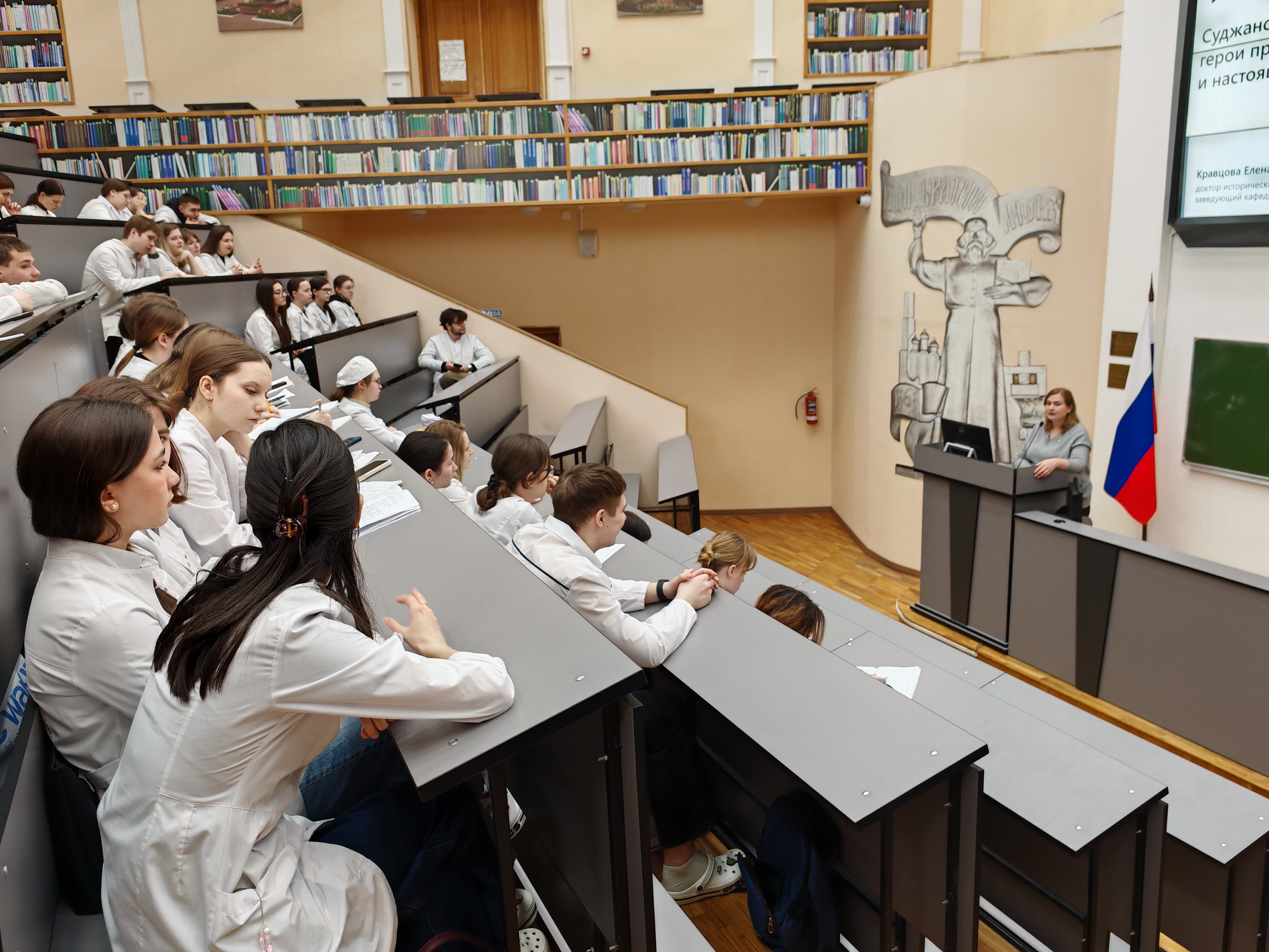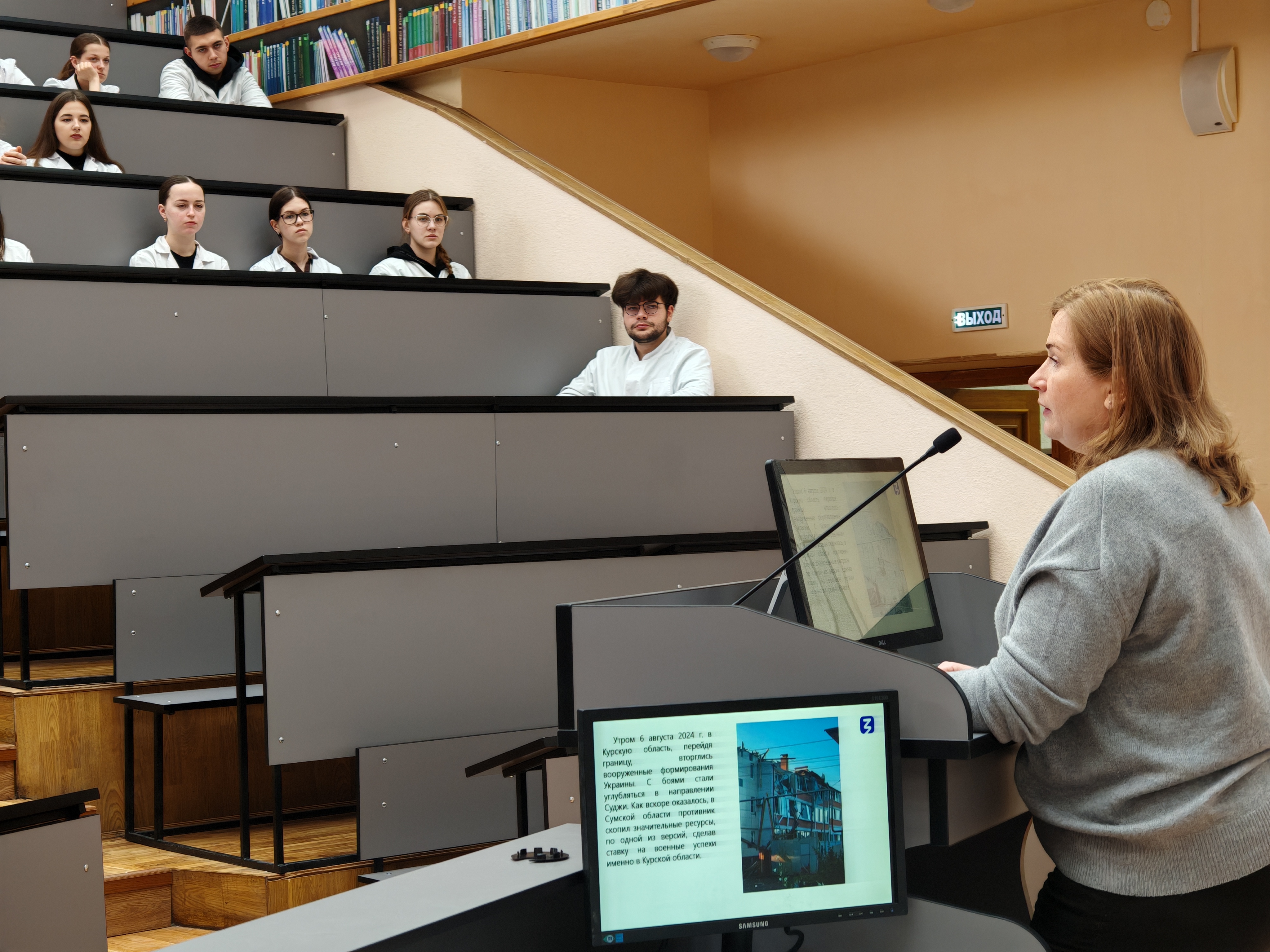 Как вы помните, - продолжила лекцию Е.С.Кравцова, - 6 августа 2024 года многие наши студенты и преподаватели, прервав каникулы и отпуска, приехали в вуз и стали активно помогать вынужденным переселенцам, пострадавшим. Студенты и педагоги работали в больницах, в пунктах временного размещения и Красного Креста, действовали вместе с сотрудниками МЧС. В КГМУ открылся ПВР, в котором ежедневно 50 человек получали жильё, питание, медицинскую помощь и правовые консультации. Люди приезжали к нам и уезжали в места постоянного проживания, а в ПВР приезжали новые нуждающиеся. Весь вуз собирал денежные средства и предметы первой необходимости для пострадавших от оккупации.