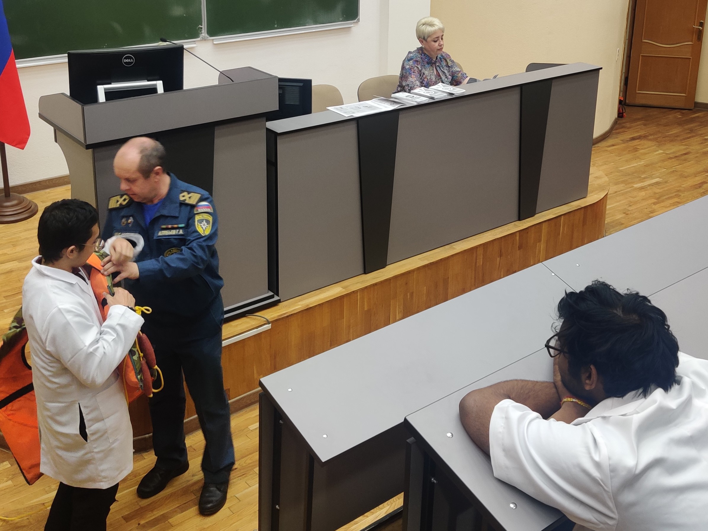 Старший инспектор Центра ГИМС ГУ МЧС России по Курской области Алябьев Г. А. напомнил иностранным студентам о правилах поведения на весенних водоёмах. Участники встречи смогли примерить спасательный жилет и получить практические рекомендации по использованию средств спасения.