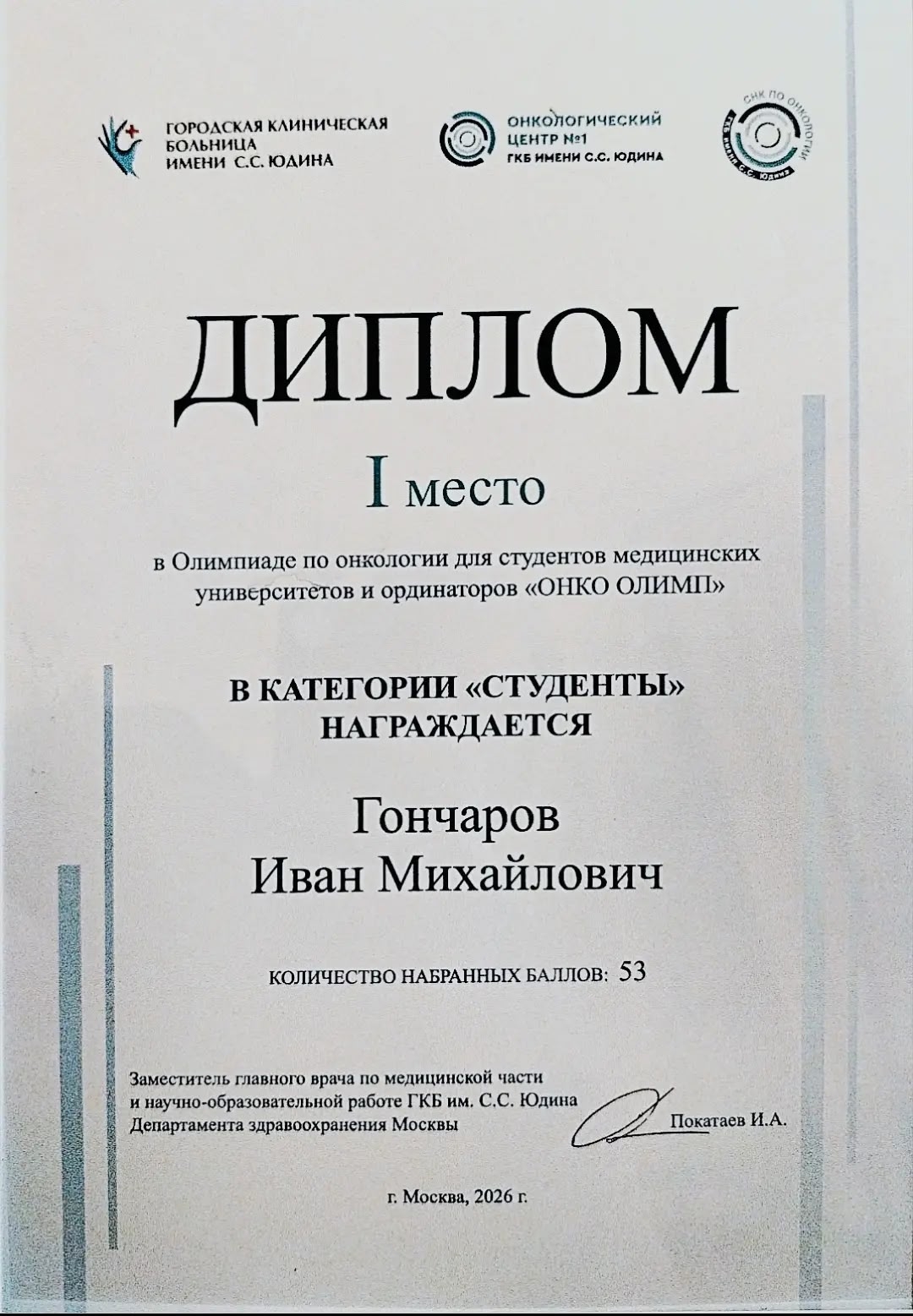 По итогам соревнования 1 место присуждено студенту Гончарову Ивану, старосте студенческого научного кружка по онкологии.